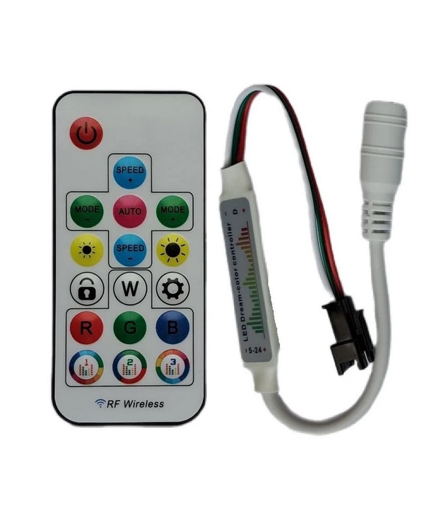 این کنترلر موزیکال مخصوص ال ای دی های برنامه پذیر، پوینت های ال ای دی، ریسه های انگشتی، استریپ ها و والواشرهای Full Color حرکتی پیکسلی (آی سی دار) – SPI ، که ولتاژ کاری آنها 24 – 5 ولت است مورد استفاده قرار می گیرد، و دارای 12 مدل افکت موزیکال آماده است.